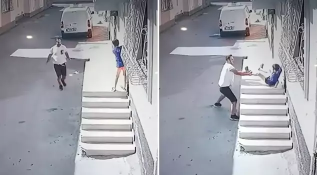 An unidentified person in Adana chased a child and caught him on the stairs of a house, grabbing him by the ankle and throwing him to the ground. The shocking moments were captured by security cameras.